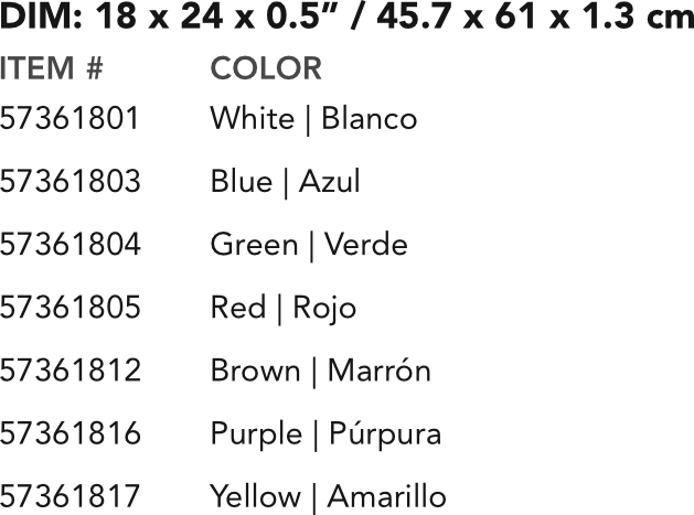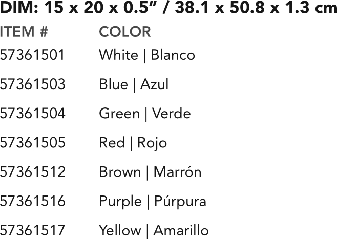 | Size | 573612 12" x 18" x ½" $12.95, 573615 15" x 20" x ½" $19.50, 573618 18" x 24" x ½" $28.95 |