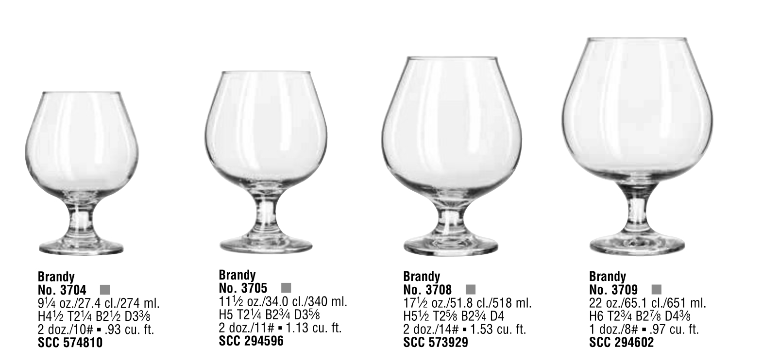 | BRANDY SNIFTERS | 3704 9¼ oz 2 dz, 3705 11½ oz 2 dz, 3708 17½ oz 2 dz, 3709 22 oz 1 dz |